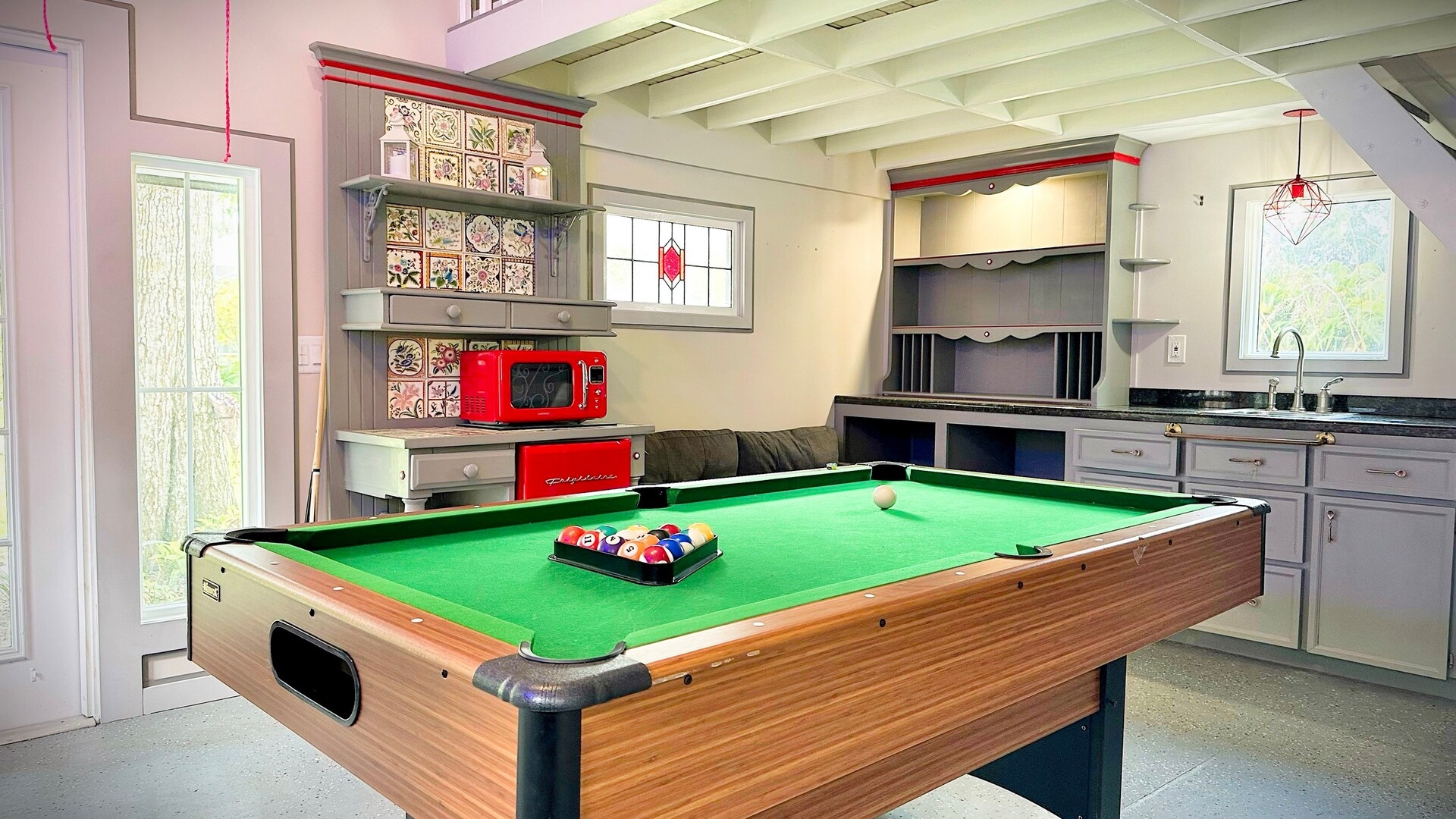Game shed with pool table and loft bed